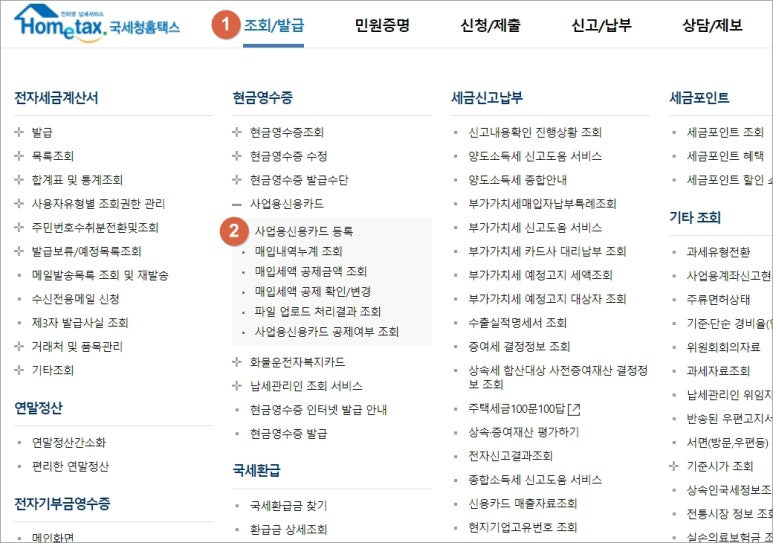 - 홈택스 > 조회/발급 > 사업용 신용카드 등록 메뉴 선택