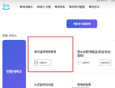 👉🏻 계좌변경 체크: '복지급여계좌변경'을 체크하고 다음 버튼을 클릭합니다. 마지막 단계에서 '제출하기'를 클릭해야 신청이 완료됩니다.